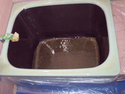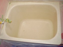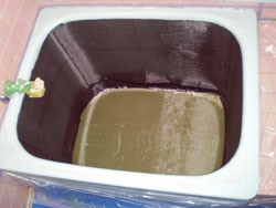 ◎側面をカーボン繊維、底をアラミド繊維で覆い、ORZ-1樹脂にて浴槽内部に、新しいFRP浴槽を作成。