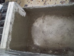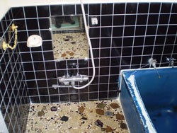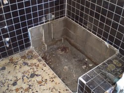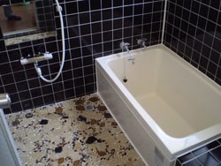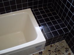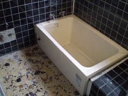 給湯管工事を行った上、水平・おさまりを吟味して浴槽設置。