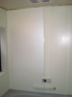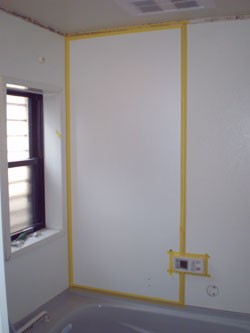 ◎下地処理後、浴室専用パネルを張込み、防水シール。