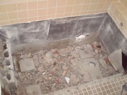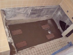 じょうご型に排水をし、浴槽足部を水平に設置。