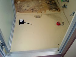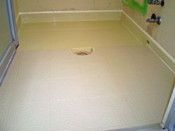 ◎浴室床専用ゴム質フロアーを、専用樹脂にて密着敷設。