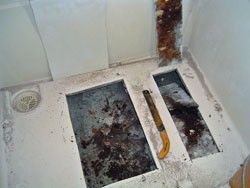 ◎洗い場床を開口し、内部腐食部分を撤去後、強固な下地を作成。