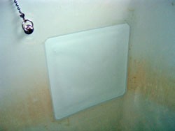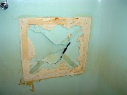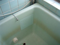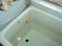◎公営住宅浴槽、破損割れ。ご主人が修理したが治らず、さらに用途の分からない接着材を使用した為、