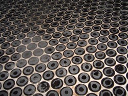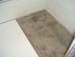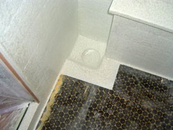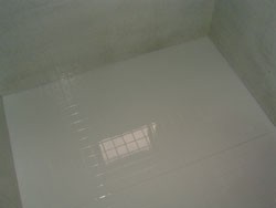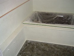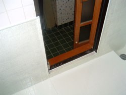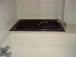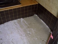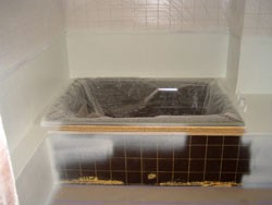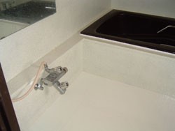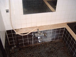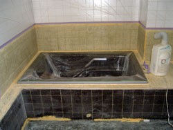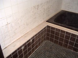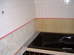 | ユニットバスへの入替えを検討。しかし壁の構造躯体の取り壊しが必要であり、入替えによる他の部分への悪影響、経費、時間が膨大。 結果、費用・時間とも約1/3程度で可能なFRP防水を兼ねた浴室美化工法に決定した。壁高さ80センチ以下FRP完全防水とする。 ◎タイル面を塩酸で脱脂清掃後、表面をグラインダーで削り樹脂の密着性を確保。 |