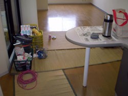 ゴザは敷くことも、巻くことも簡単で、汚れや砂、水分も通しません。狭い所にもフィットするし、最後には汚れごと巻いてしまい外で払うこともできます。