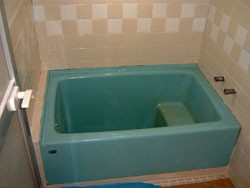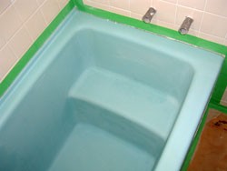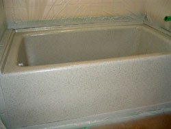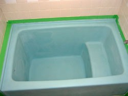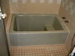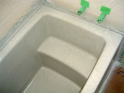 浴槽用特殊樹脂を、5層に重ねる。(プライマー樹脂+グレー色下地樹脂+御影石調樹脂+クリアー層用樹脂+表面保護用樹脂)